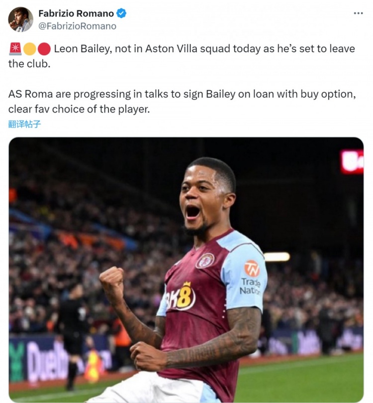罗马诺指出,利昂-贝利未入选维拉英超首轮的名单,因为他即将离队。罗马正在推进租借利昂-贝利的谈判,协议中将包含选择买断条款。罗马是利昂-贝利明确的首选下家。